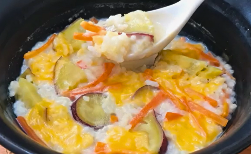 とろ〜りアツアツ!「さつまいもとにんじんのミルク雑炊」