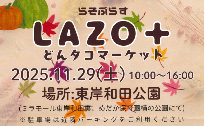 2025年11月29日(土)、東岸和田公園(ミラモール東岸和田裏、めだか保育園横)にて、「らそぷらす LAZO+ どんタコマーケット」が開催されます。キッチンカー、パン、コーヒー、ワークショップ、ハンドメイド、整体、耳つぼなど19店舗が出店する、地域密着型のマルシェイベントです。