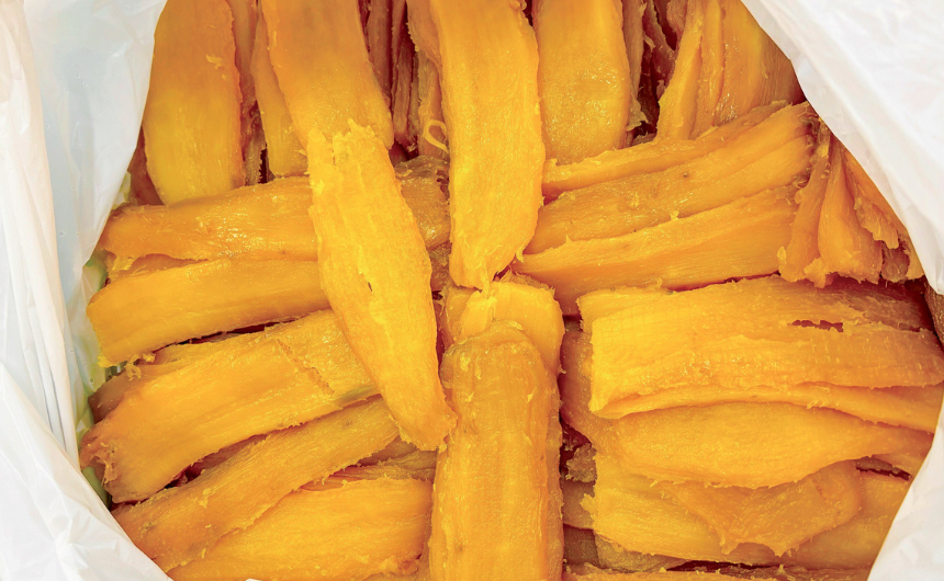 最大の特徴は、独自の「ソフトドライ製法」にあります。一般的な干し芋といえば、少し硬めで噛み応えのあるものを想像しがちですが、こちらの干し芋は驚くほど「しっとり・もっちり」。国産のブランド芋「紅はるか」の中でも、特に糖度が上がったものだけを厳選し、熟練のスタッフが一つひとつ手作業で皮を剥き、丁寧に加工しています。