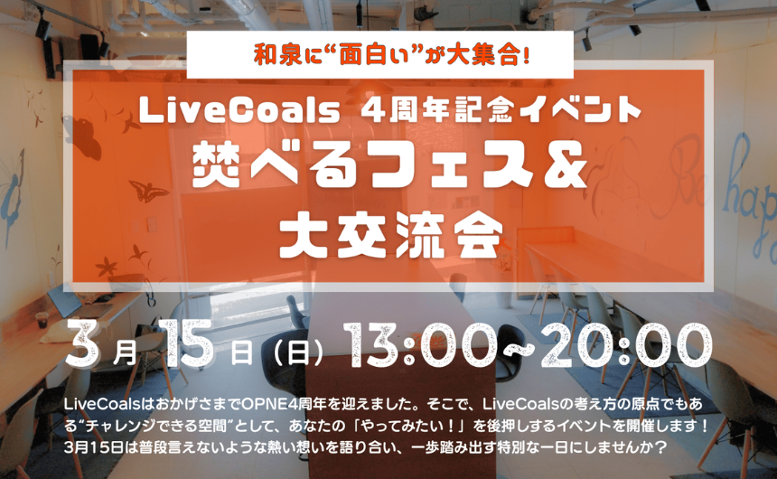 JR阪和線「和泉府中」駅から徒歩圏内にあるコワーキングスペース&シェアオフィス「LiveCoals(ライブコールズ)」が、オープン4周年を迎えます。これを記念して、2026年3月15日(日)、地域の「面白い」が集まるイベント『焚べるフェス&大交流会』が開催されます。新たなチャレンジや出会いの場として企画された本イベントの概要をご紹介します。