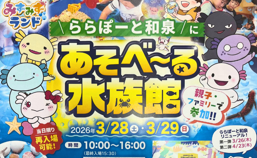 ららぽーと和泉に、大人気の体験型移動水族館「あそべ~る水族館」がやってきます!2026年3月28日(土)・29日(日)の2日間、生き物と直接ふれあえる貴重なチャンスにお子様も大喜び間違いなし。週末の家族のお出かけにぴったりな、ワクワクのイベントをご紹介します。
