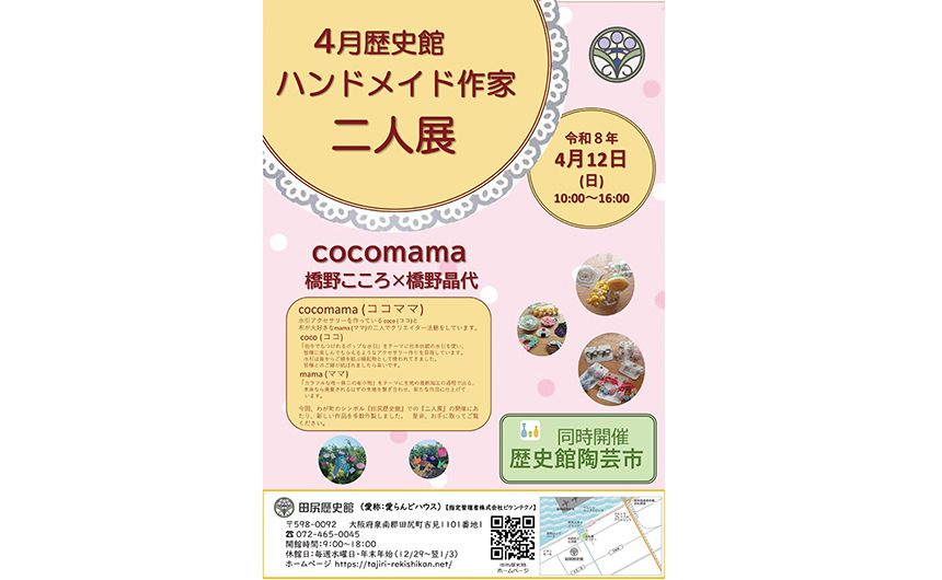 2026年4月12日(日)、田尻町のシンボルである「田尻歴史館」にて、ハンドメイド作家ユニットによる二人展「cocomama(ココママ)」が開催されます。伝統とモダンが融合した素敵な作品たちが、歴史ある空間を彩ります。