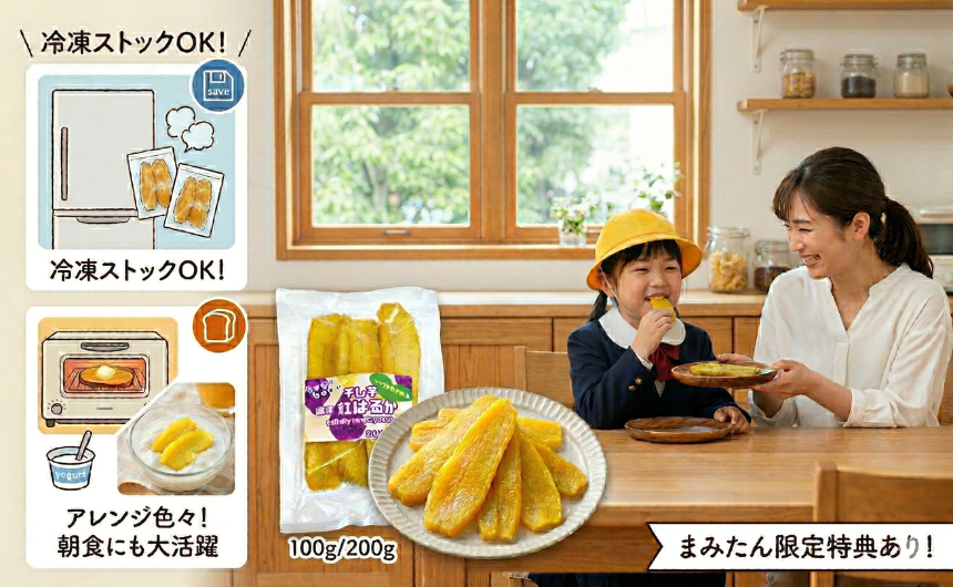 最大の魅力は、その圧倒的な「安心感」。原材料はさつまいものみで、保存料や着色料などは一切使用していない「無添加」のおやつです。市販のスナック菓子とは違い、自然本来の甘みがぎゅっと凝縮されているため、小さなお子様からご年配の方まで、三世代で安心して楽しむことができます。「これさえあれば安心」と思える、からだに優しいストックおやつの大本命です。