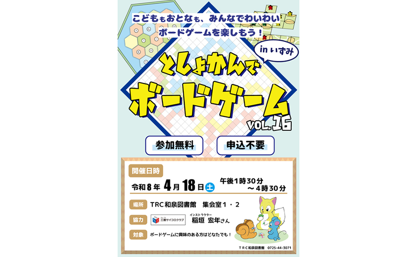 TRC和泉図書館にて、子どもから大人まで一緒に楽しめる「としょかんでボードゲーム in いずみ」が開催されます。ボードゲームは、ルールを守りながら対面で遊ぶことで、考える力やコミュニケーション能力を育むことができる今注目のアクティビティです。図書館という静かな空間で、新しい遊びの世界に触れてみませんか?