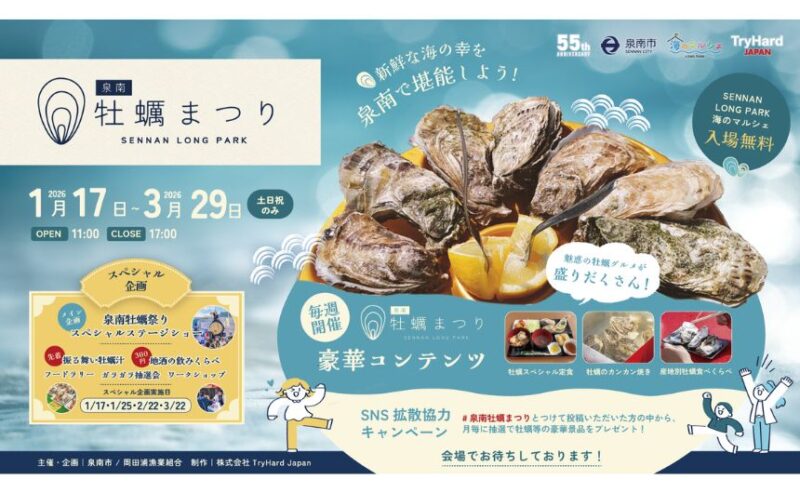 【泉南市】2026年1月17日(土曜日)~3月29日(日曜日)の土日祝のみ 泉南牡蠣まつり開催!絶品グルメと無料振る舞い汁を満喫